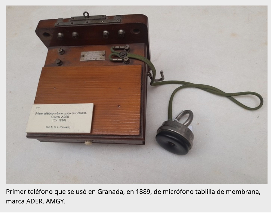 El primer aparato telefónico que se usó en Granada en 1889 se conserva en la colección de Miguel Giménez Yanguas. Es un artilugio de la marca ADER, formado por dos partes: el auricular pendiente de un cable y un micrófono consistente en una tablilla con membrana de madera a la que había que hablarle para que vibrase y transmitiese los impulsos al condensador; no muy lejos ni demasiado cerca. La empresa elaboró unos folletos explicativos e hizo demostraciones para enseñar a utilizar el teléfono. Había que empezar por presionar un botón que avisaba a la operadora en la central, conectaba con el número que se deseaba y daba el aviso de que se comenzara a hablar.