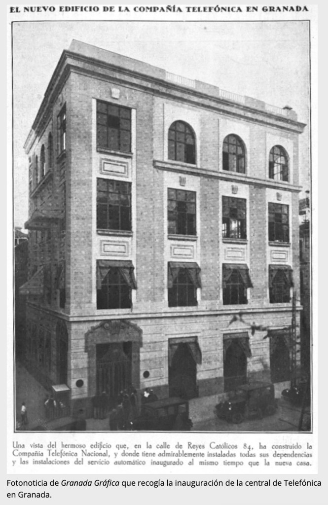 El próximo 19 de abril de 2024 hará un siglo de la creación de Compañía Telefónica Nacional de España. También de su desembarco en Granada para absorber a las pequeñas compañías locales que operaban con rudimentarios sistemas. Será la fecha en que cerrará la totalidad de su red centenaria de cobre para quedar sólo con fibra óptica y por ondas. Supondrá la desaparición total de la actividad en su primer edificio construido en la calle Reyes Católicos, 55, de Granada. El bloque búnker no desaparecerá, ya que fue vendido hace siete años para otras actividades. El que sí desapareció al construir el mamotreto actual fue un coqueto bloque historicista que entonces tenía fachada a cuatro calles. Lo que sigue son retazos de la arqueología del teléfono en Granada.