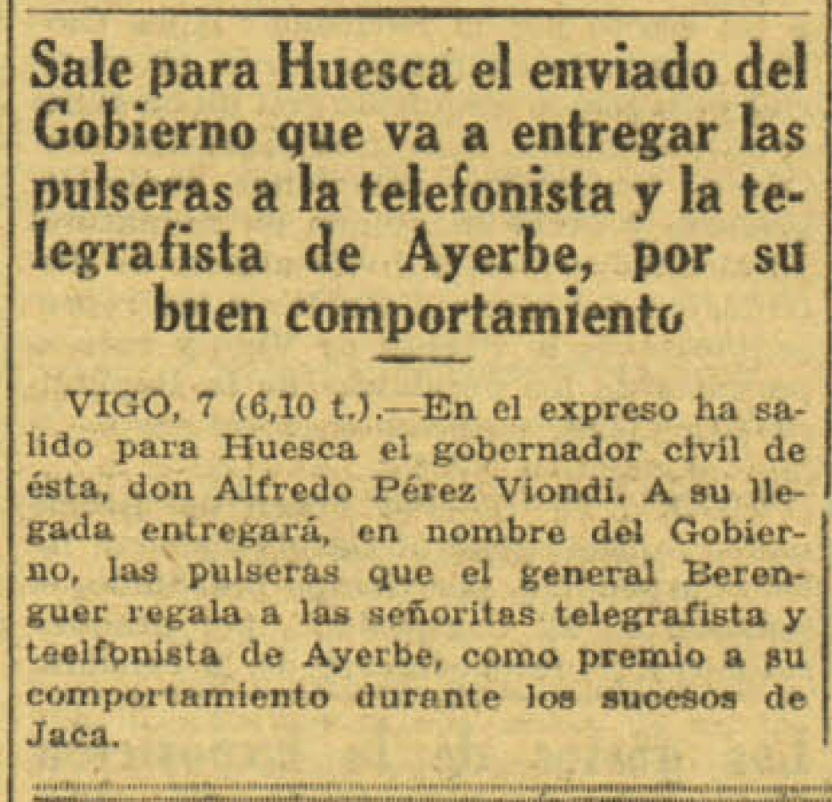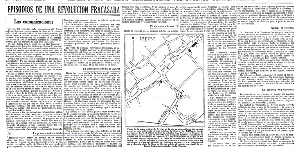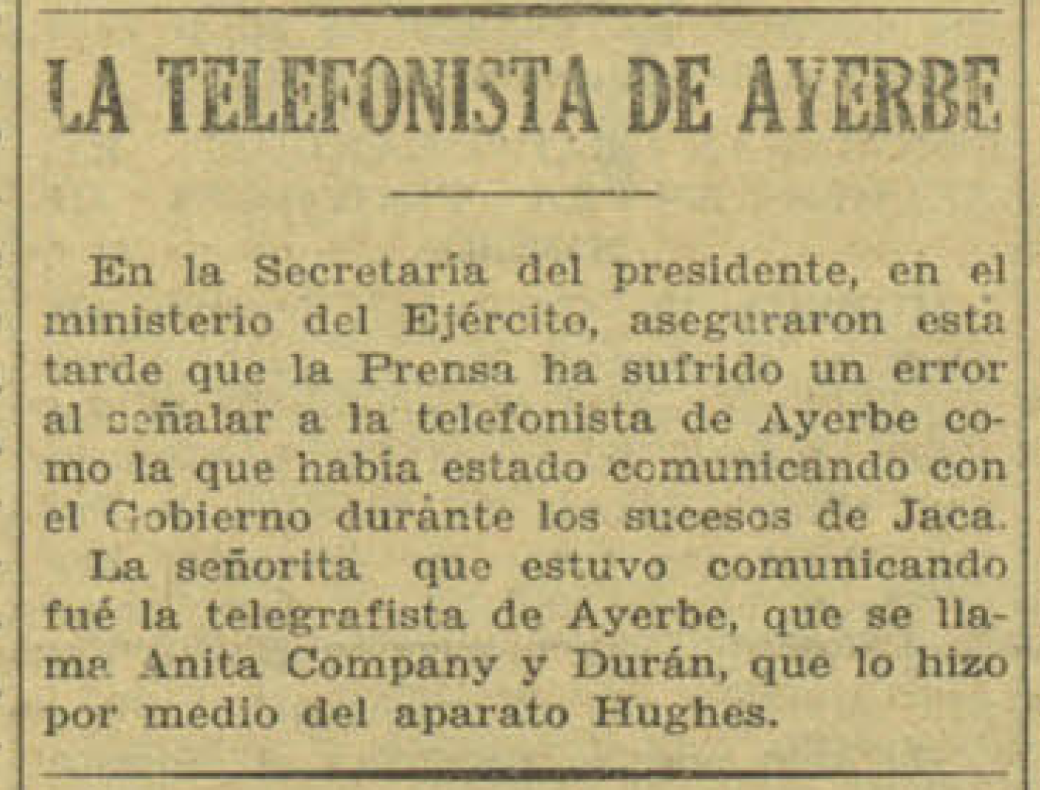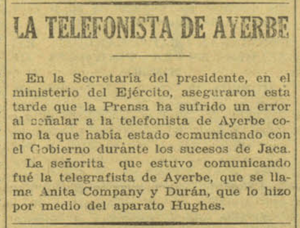 – También en el trabajo de Jose Luis Garrot Garrot, «La Sublevación de Jaca y Cuatro Vientos» en la que igualmente se cita a la telefonista, pero considerando que fue erróneamente implicada en perjuicio de la telegrafista Ana Companys. ↩︎ - Las crónicas más destacadas aparecidas en el ABC (procedentes de su hemeroteca) las hemos recopilado en este descargable; y en este otro las aparecidas en otros periódicos (El Diarios de Huesca, Ahora, El Liberal, La Voz, La Voz de Aragón, La Libertad, La Nación) obtenidos de las Hemerotecas de la BNE, del MECD y del Diario de Huesca ↩︎