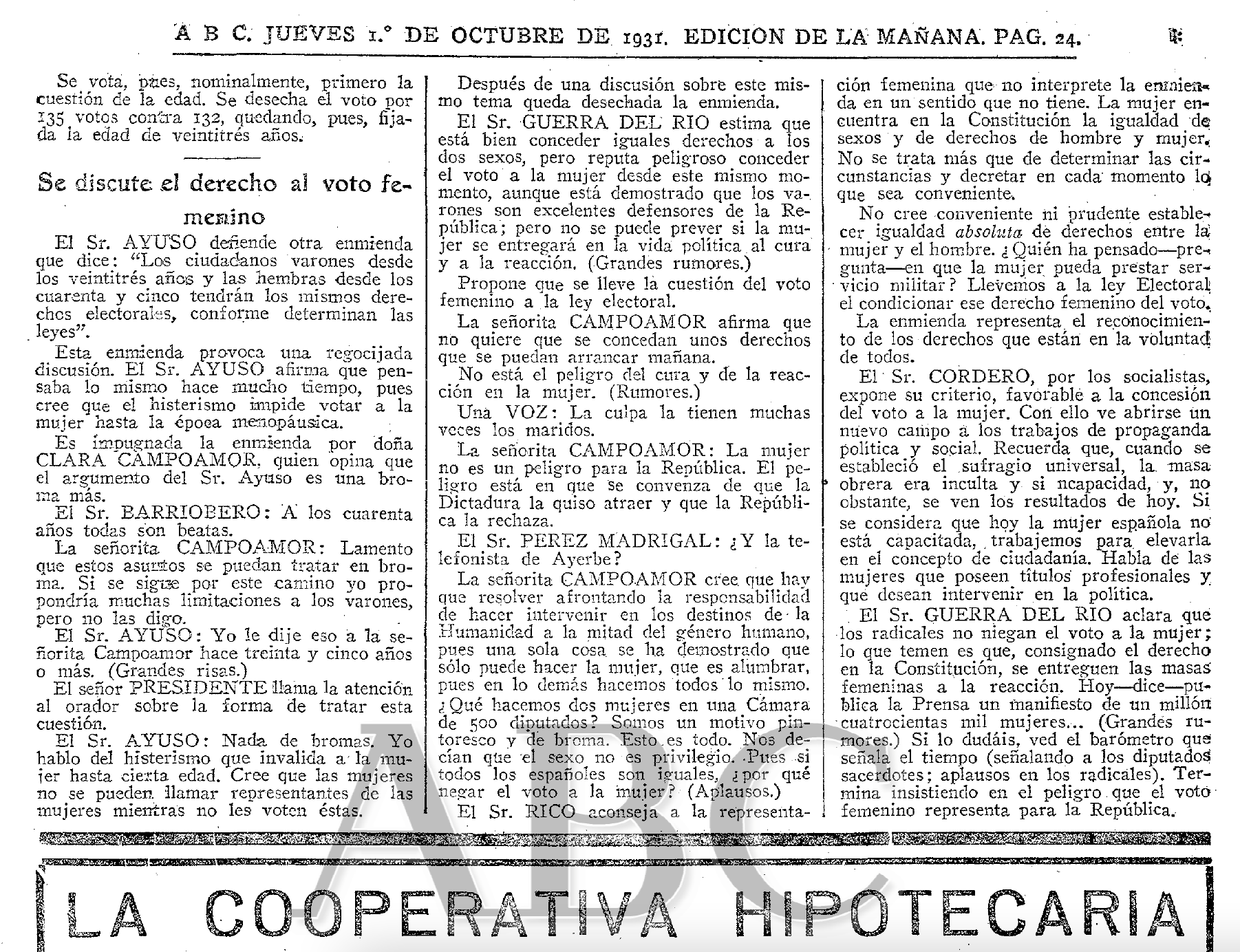 «La Srta. Campoamor: … y cuando la mujer, al advenimiento de la República, asistió al hombre en la forma que lo hizo. . . (EI Sr. Pérez Madrigal: ¿Y la telefonista de Ayerbe?) … No la dé Su Señoría el voto, Sr. Madrigal, córtele la cabeza si quiere…»