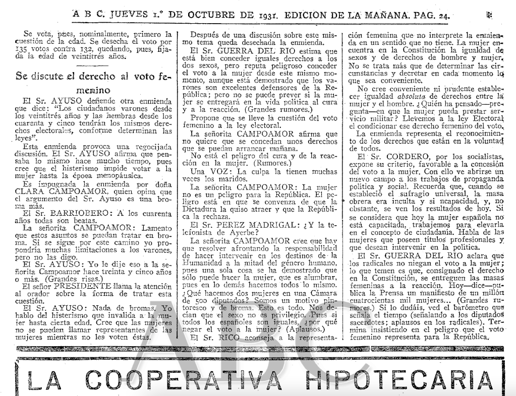 Y volviendo por dónde comenzábamos, siguiendo el diario parlamentario de las Cortes, de la sesión de 30 de septiembre de 1931, intervenía la diputada Clara Campoamor defendiendo en su discurso el voto femenino, cuando se la interrumpió, en voz alta, increpándola: ¿Y la telefonista de Ayerbe?