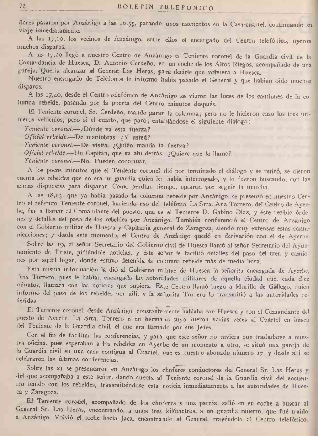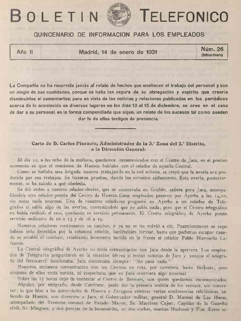 1930 un extraordinario con gran lujo de detalles gráficos…En dicho extraordinario se demuestra terminantemente, partiendo de la proeza ejecutada por la funesta telefonista de Ayerbe con las mismas proezas ejecutadas por otros cuantos esbirros de la Telefónica, cuyos nombres y cargos se detallan claramente, transcribiendo incluso las cartas cursadas entre los directores de la Compañía a las autoridades. Este documento demuestra concluyentemente la significación de una Empresa dirigida por el marqués de Urquijo y otros varios y significados monárquicos, y es una prueba testifical que puede ilustrar a satisfacción al señor fiscal general de la República sobre los principales culpables del asesinato de los mártires Galán y García Hernández.»