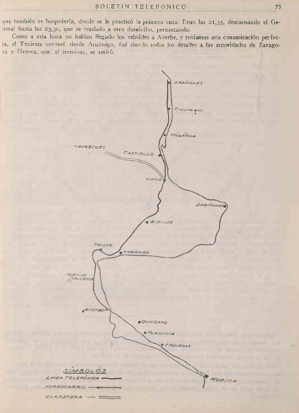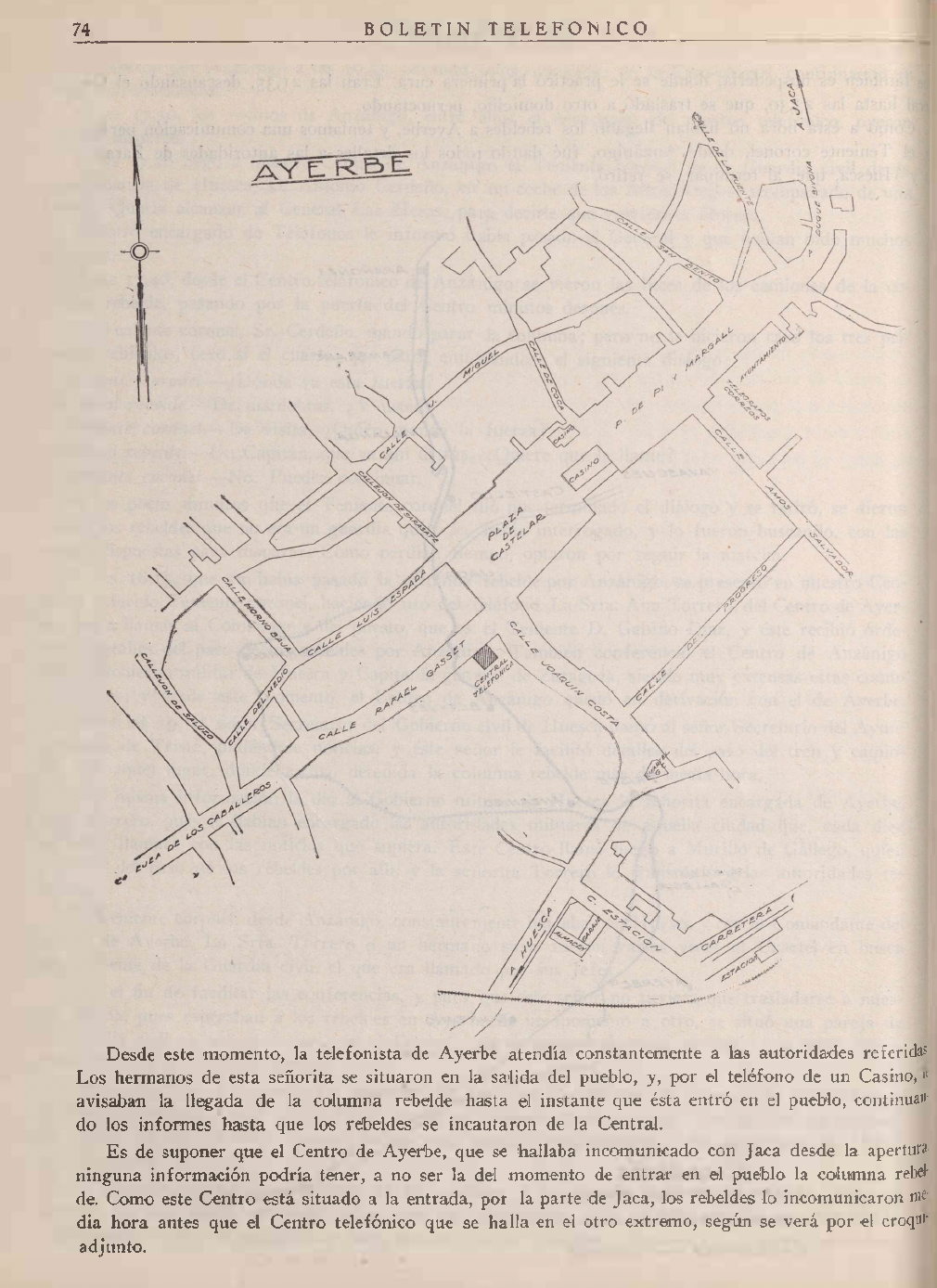 En diciembre de 1930 el teléfono llevaba instalado apenas un año en Ayerbe. La localidad se benefició del hecho de encontrarse justamente en el trazado de la línea telefónica interurbana Zaragoza-Huesca-Jaca-Canfranc cuyos trabajos se iniciaron desde allí, entre noviembre de 1928 y diciembre de 1929. Concretamente Ayerbe dispuso primero de servicio interurbano el 23 de abril y luego el urbano el 6 de diciembre del citado 1929 (Jaca, ya lo tenía anteriormente)2.
