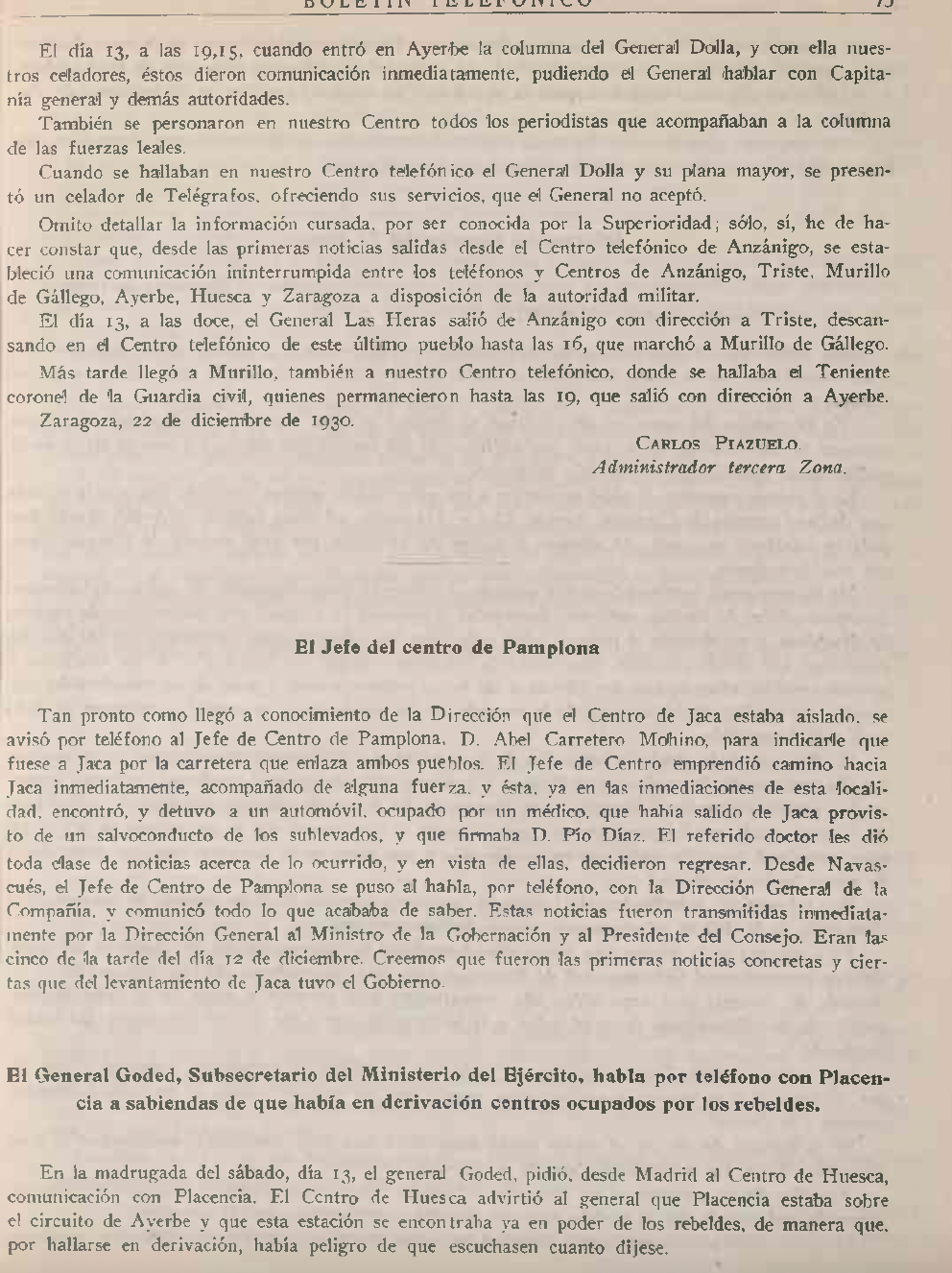 - Los historiadores han escrito mucho sobre el episodio de la sublevación de Jaca, pero sólo unos pocos mencionan el papel de las operadoras de telecomunicaciones de la zona, al contrario de lo que ocurrió en su momento con la prensa de la época. Destacamos los dos siguientes: