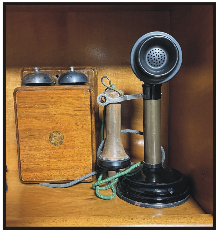 LM Ericsson tipo AB 123, número de serie: 1592444, de 1918; y Teléfono tipo Candlestick con timbre externo de madera Bellset nº1 (Mark 235).