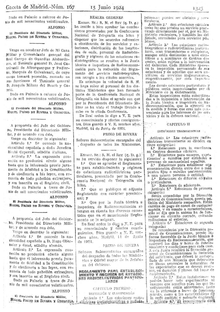 Corría en España el año 1924 cuando, a raíz de la Conferencia Nacional de Telegrafía sin Hilos, convocada por el Directorio militar de Primo de Rivera, que había accedido al poder tras el golpe de Estado protagonizado el 13 de septiembre del año precedente, se publicó el Reglamento para establecimiento y régimen de estaciones radioeléctrica particulares1 (Fig.1). Previamente, y al amparo del Real Decreto de 27 de febrero de 19232, el gobierno de García Prieto había dictado un reglamento provisional3, mientras que habían comenzado a transitar algunas emisoras por las frecuencias.