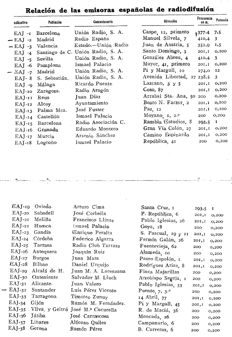 De acuerdo con la Real Orden de 14 de junio de 1924, la primera concesión (EAJ-1) recayó, el 14 de julio de 1924, en Radio Barcelona que, desde el hotel Colón, inauguró, el 14 de noviembre siguiente a las 18h30, sus emisiones oficialmente con la voz de María Sabater (Fig. 3) y con un discurso del entonces alcalde de la ciudad, Darío Rumeu y Freixa, barón de Viver.