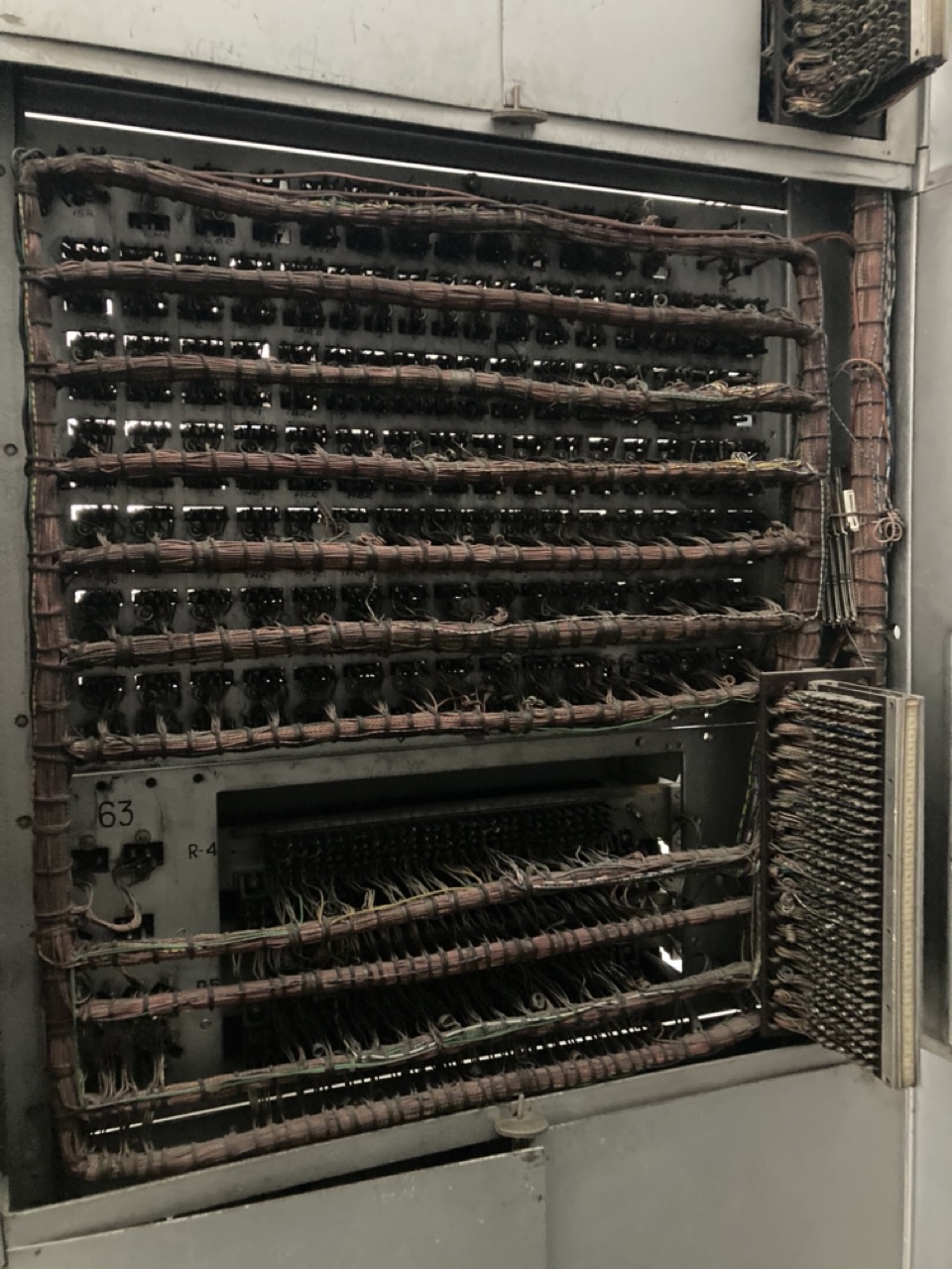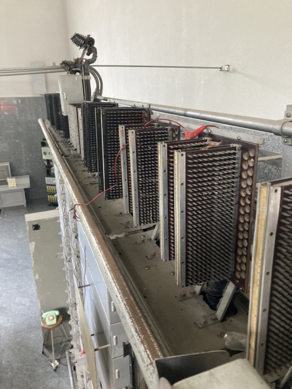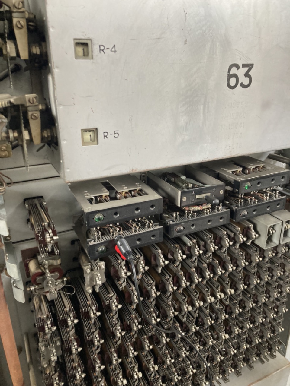 Se trata de una sección de Conmutación equipada para 200 líneas del sistema Rotary 7A2 compuesta por diez bastidores en una fila.