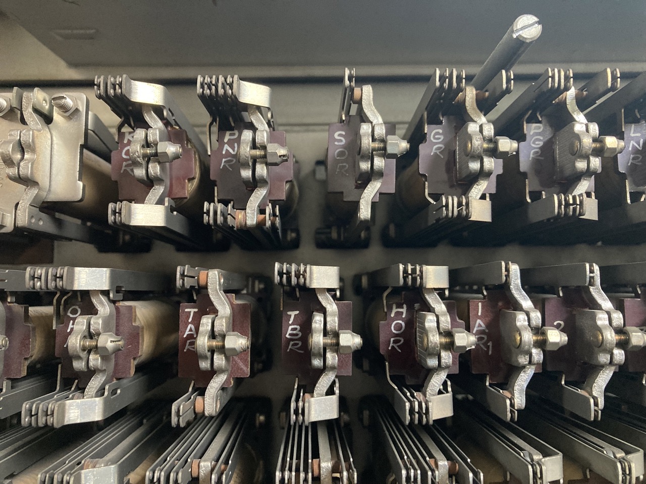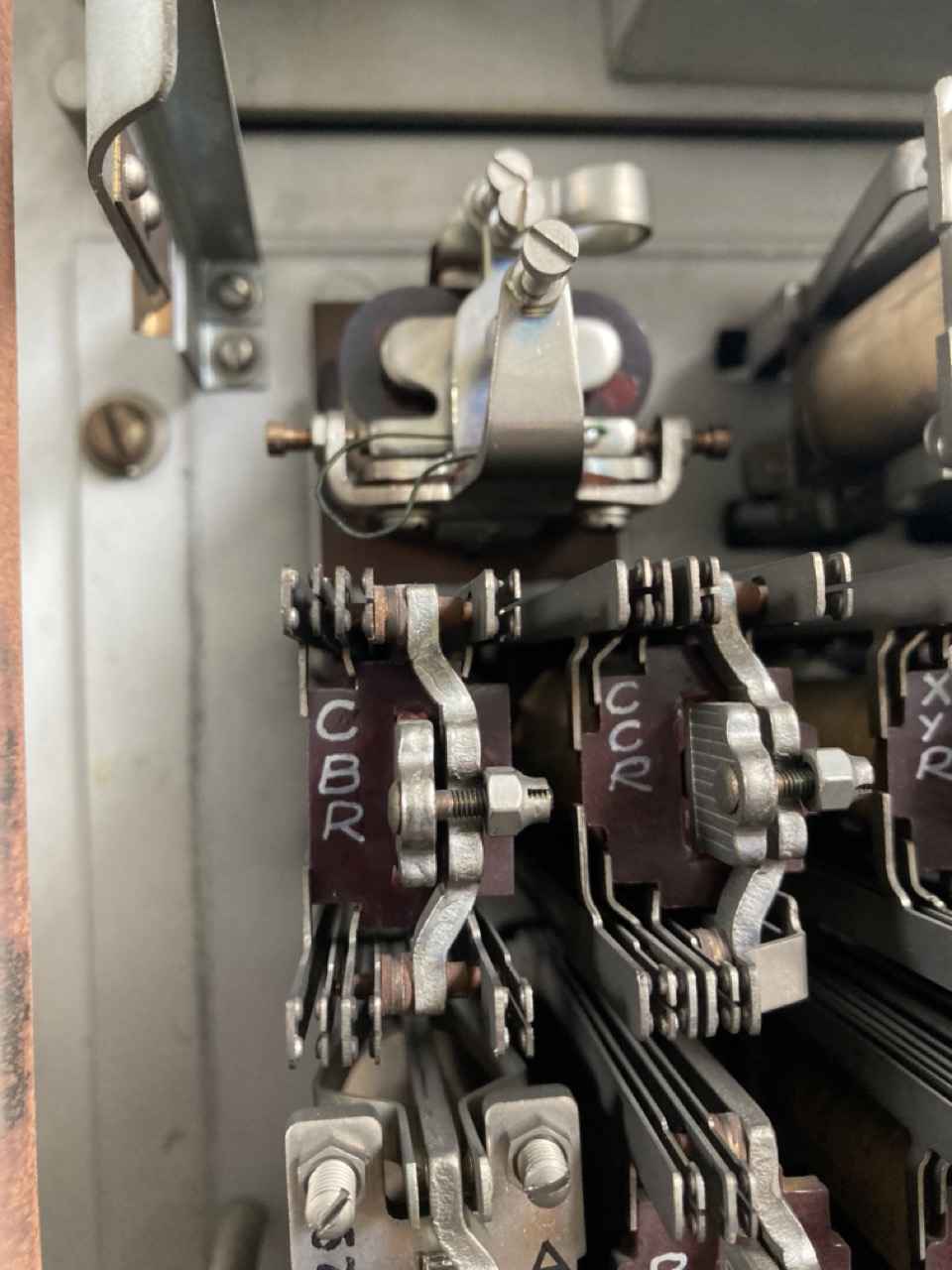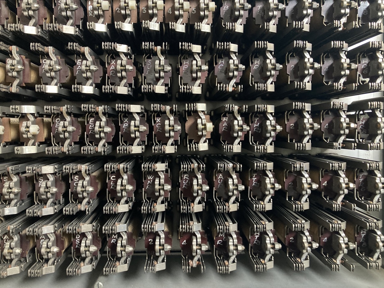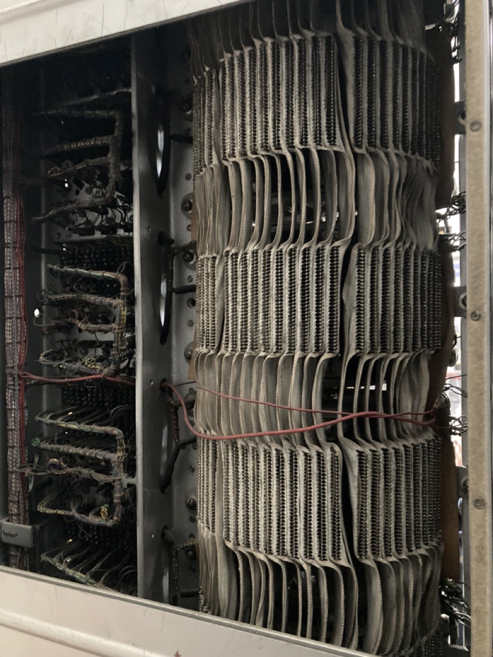 Se trata de una sección de Conmutación equipada para 200 líneas del sistema Rotary 7A2 compuesta por diez bastidores en una fila.