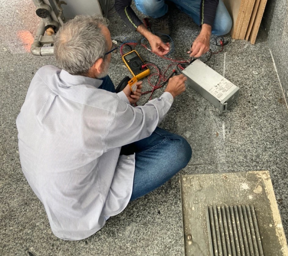 Comenzamos con el suministro de energía. Veamos, el enchufe… ¡aquí! El convertidor de CC para suministro de los -48v… ¡AVERIADO! Lo pone claramente en un papel adosado. Sin pensárselo dos veces, Miguel Ángel se lo lleva a casa para «cacharrearlo» buscando la avería. No es fácil, el transformador parece en corto. Habrá que buscar uno nuevo. Mientras tantos tiramos de nuestros recursos. Miguel Ángel tiene un convertidor de prestaciones parecidas y en la empresa de Juan Javier Iglesia, otro teleco que le va el tema nos prestan otro. Con esto… ¡arrancamos motores!. Y si lo conseguimos, luego habrá que ir paso a paso conectando etapas y para esto sí tenemos planos bien y sí no, habrá que ir tirando del hilo con los esquemas.