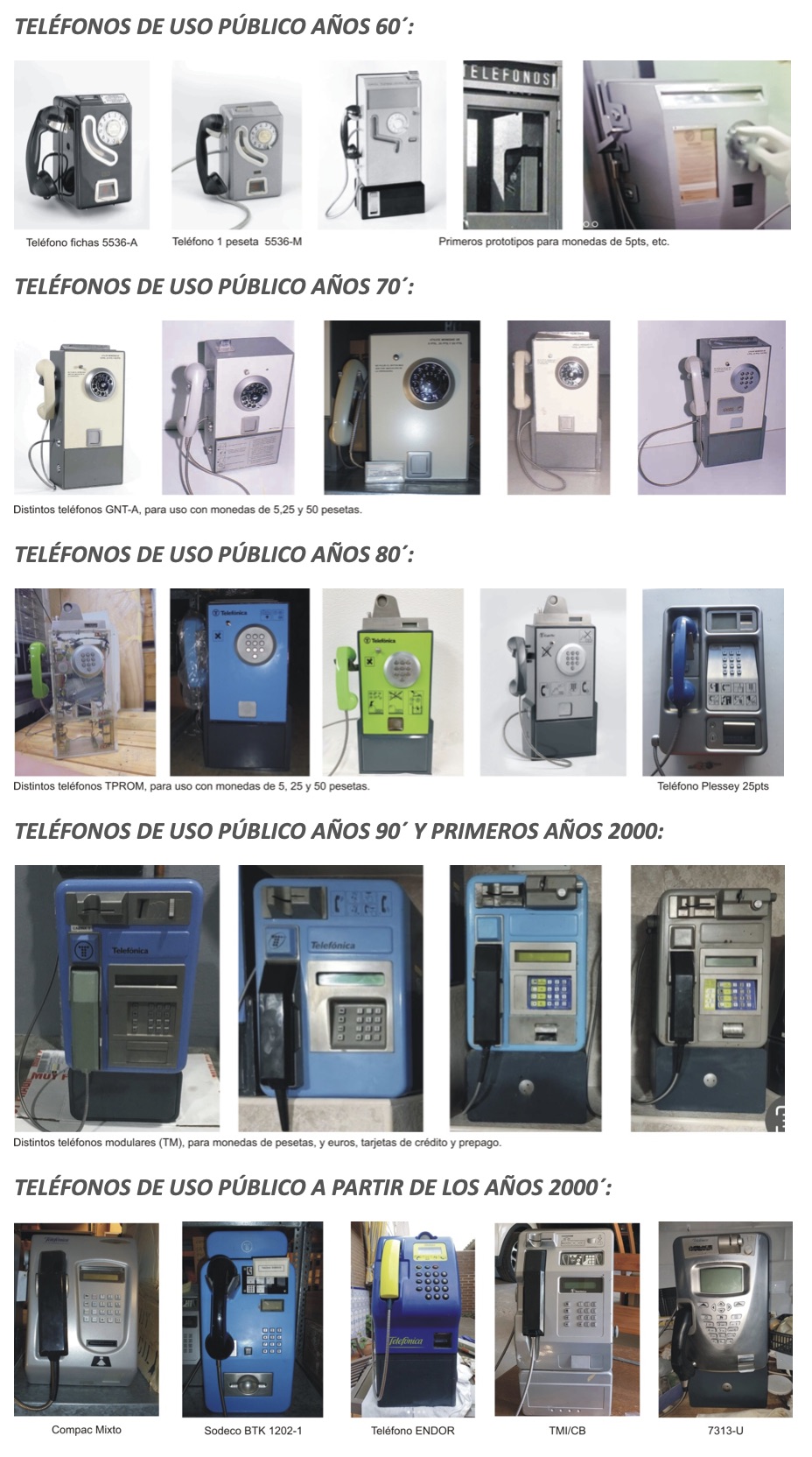 Se continúa presentando fotográficamente los diferentes modelos de aparatos telefónicos, de fichas, monedas o tarjeta, empleados en las cabinas agrupados por décadas según fueron apareciendo, 60′, 70′, 80′, 90´y 2000.
