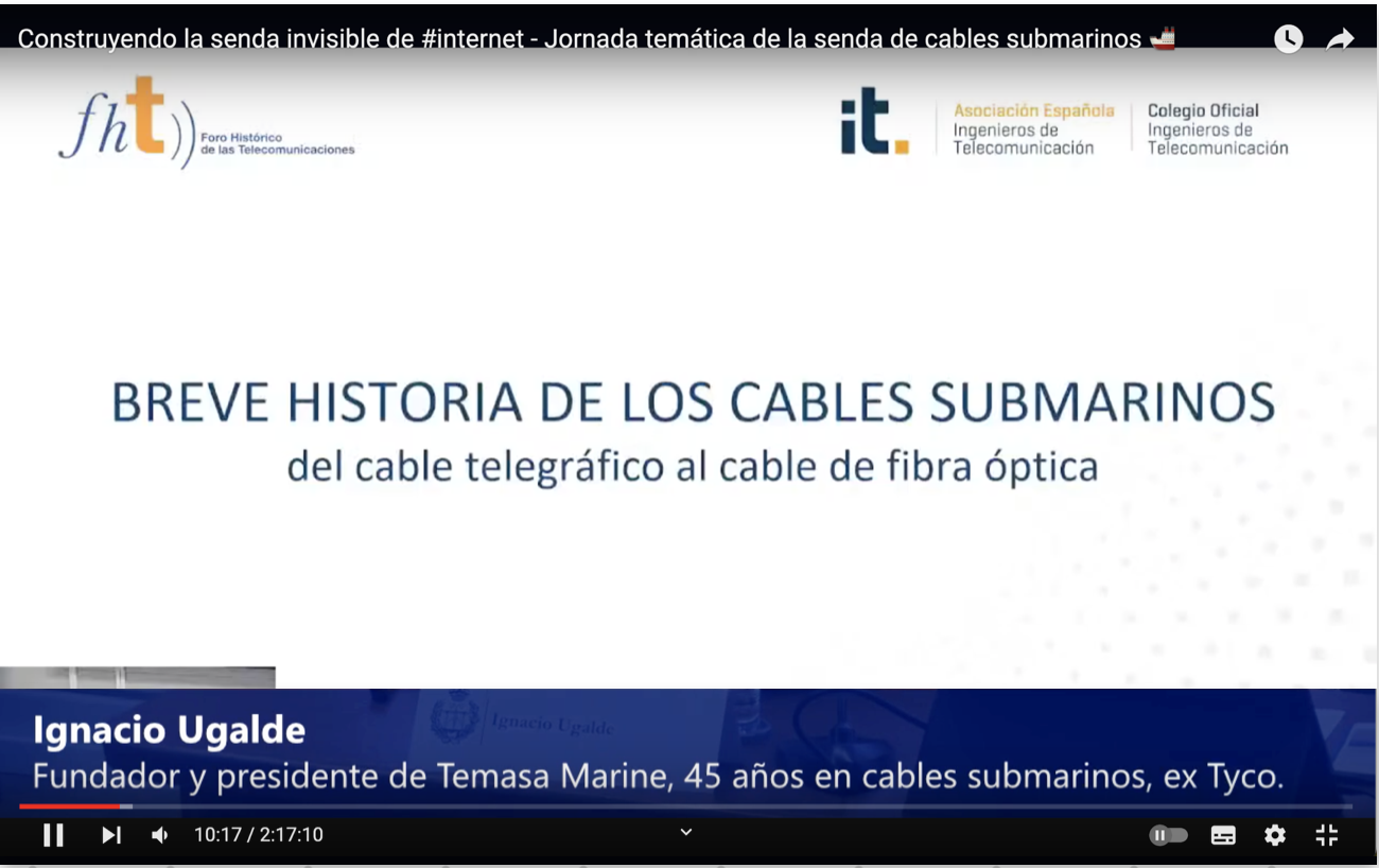| Historia. Evolución histórica de los cables submarinos: Del telégrafo a la fibra óptica, Ignacio Ugalde, fundador y presidente de Temasa Marine, 45 años en cables submarinos, ex Tyco. |