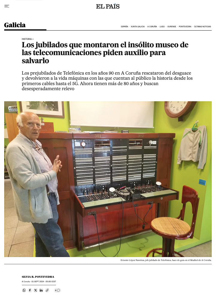 Entre todas ellas, siempre hemos destacado el muy singular caso de MUDITEL, el Museo Didáctico de las Telecomunicaciones de La Coruña, al que hemos dedicado varias entradas y apartados, y que recientemente ha tenido repercusión en prensa por el artículo publicado en El País el pasado 1 de septiembre de 2024 con el título «Los jubilados que montaron el insólito museo de las telecomunicaciones piden auxilio para salvarlo» y el siguiente subtítulo: