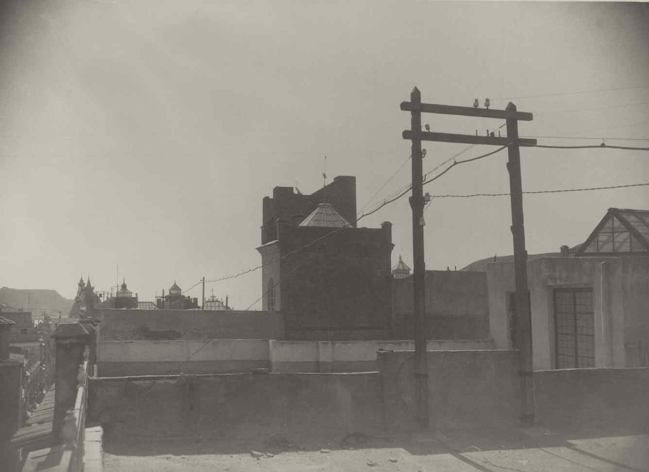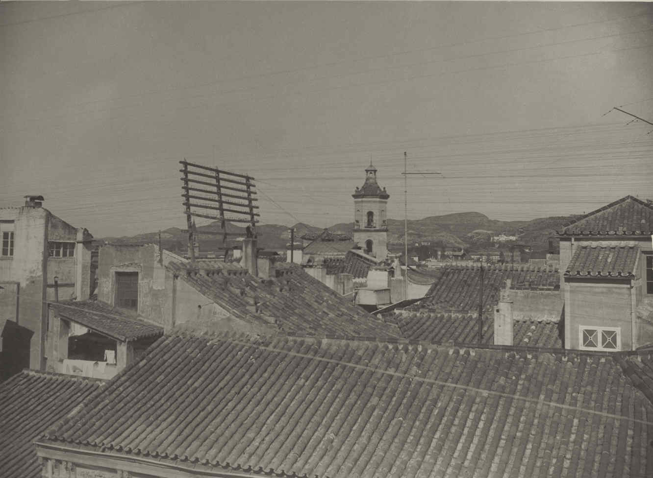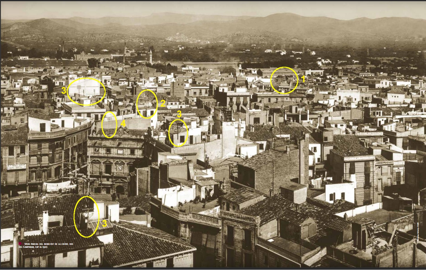 Panorámica de Reus en 1927 donde se aprecian diversos elementos de la Red Telefónica Urbana. 1.- Templete, 2.- Caballete o herce, 3 y 4.- Pescantes o palomillas. Fuente: Centre de la Imatge Mas Iglesias (CIMIR).