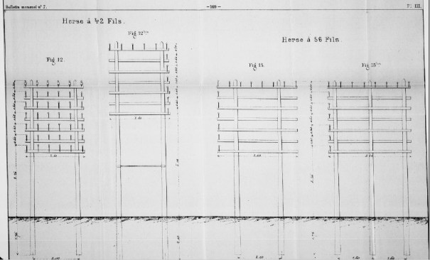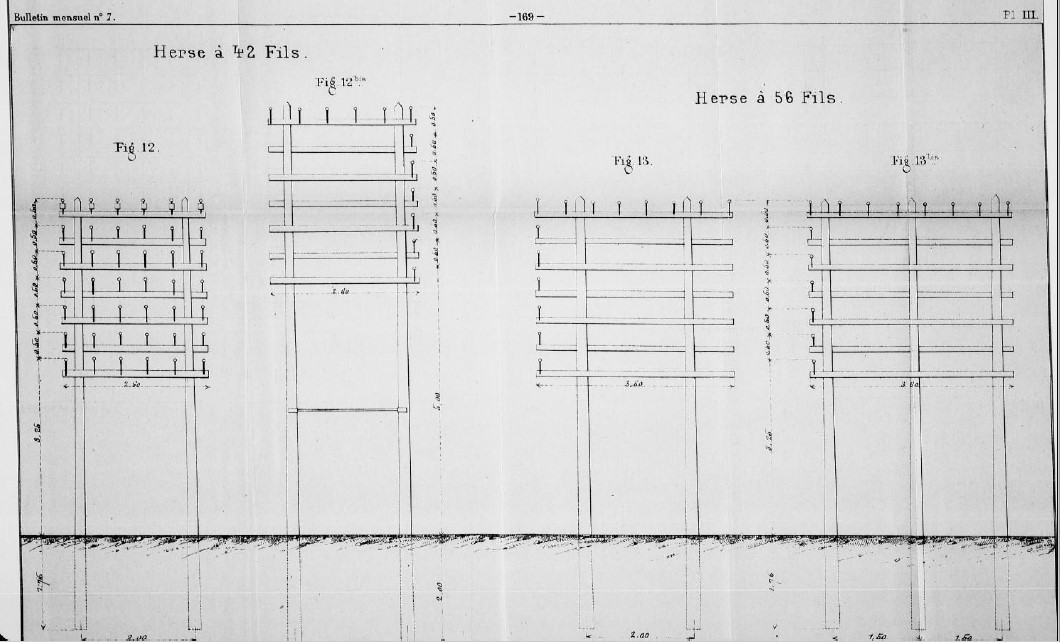 Buscando ya en documentación francesa, se encuentra que herse se define como un armazón de madera y en el Boletín de mayo de 18943, se desarrolla la instrucción nº. 447 que trata de la construcción de líneas principales y se define la construcción de los herses como un tipo de apoyo.