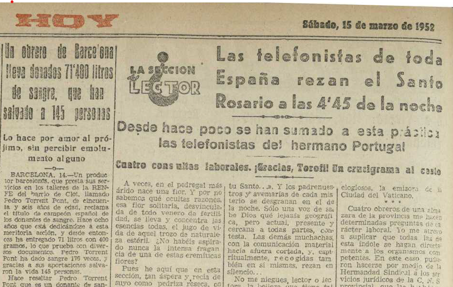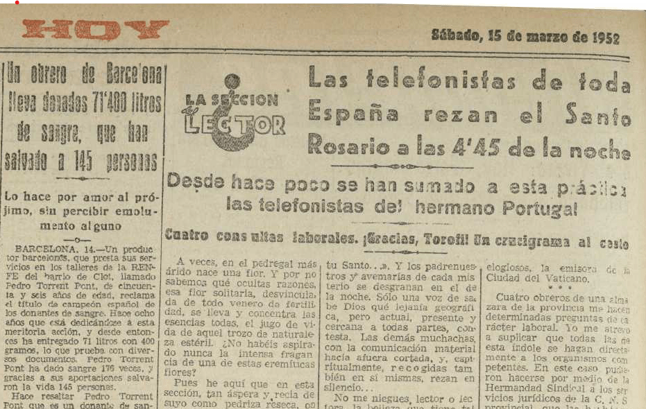Recorte de Hoy (Badajoz, 15 de marzo de 1952) con la noticia de las telefonistas