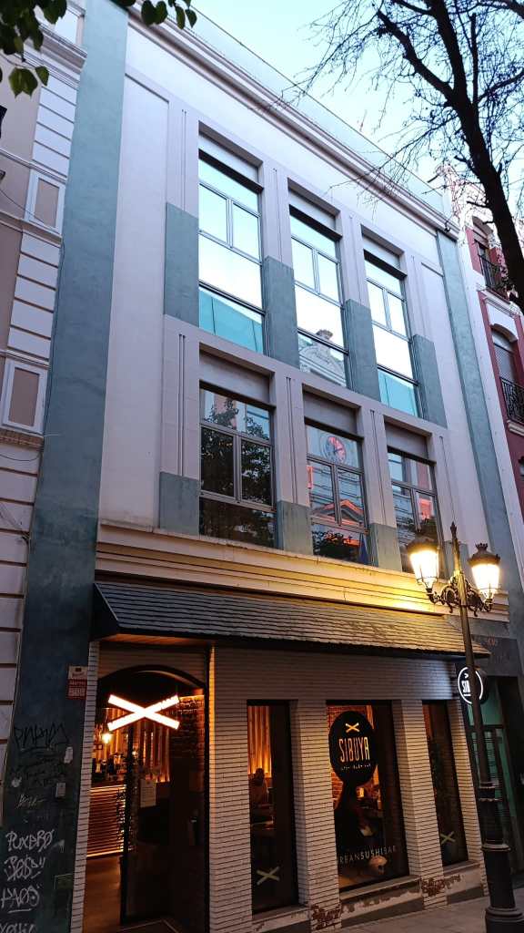 Fachada del antiguo edificio de la central de CTNE Badajoz-Zurbarán, en la calle Obispo san Juan de Ribera, donde trabajó Marce (Lo vendió Telefónica y actualmente es para otros usos, siendo la fachada la misma que la original)