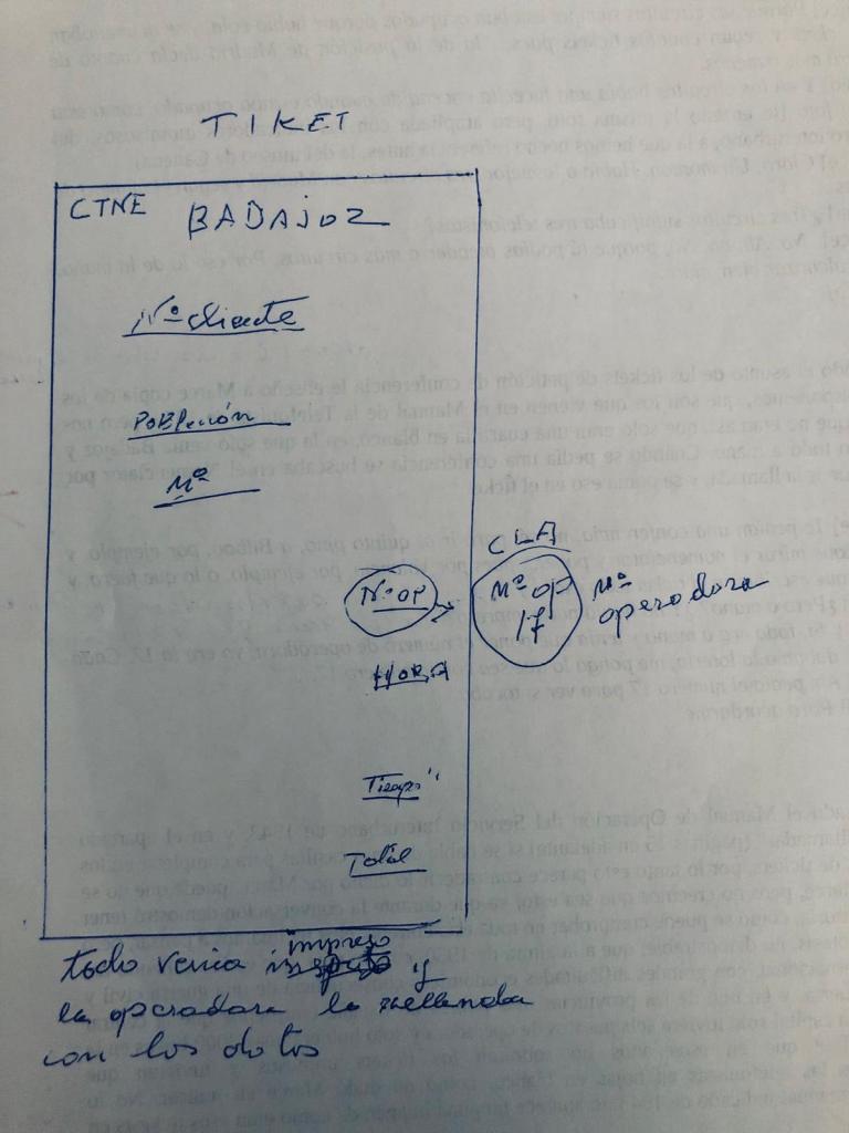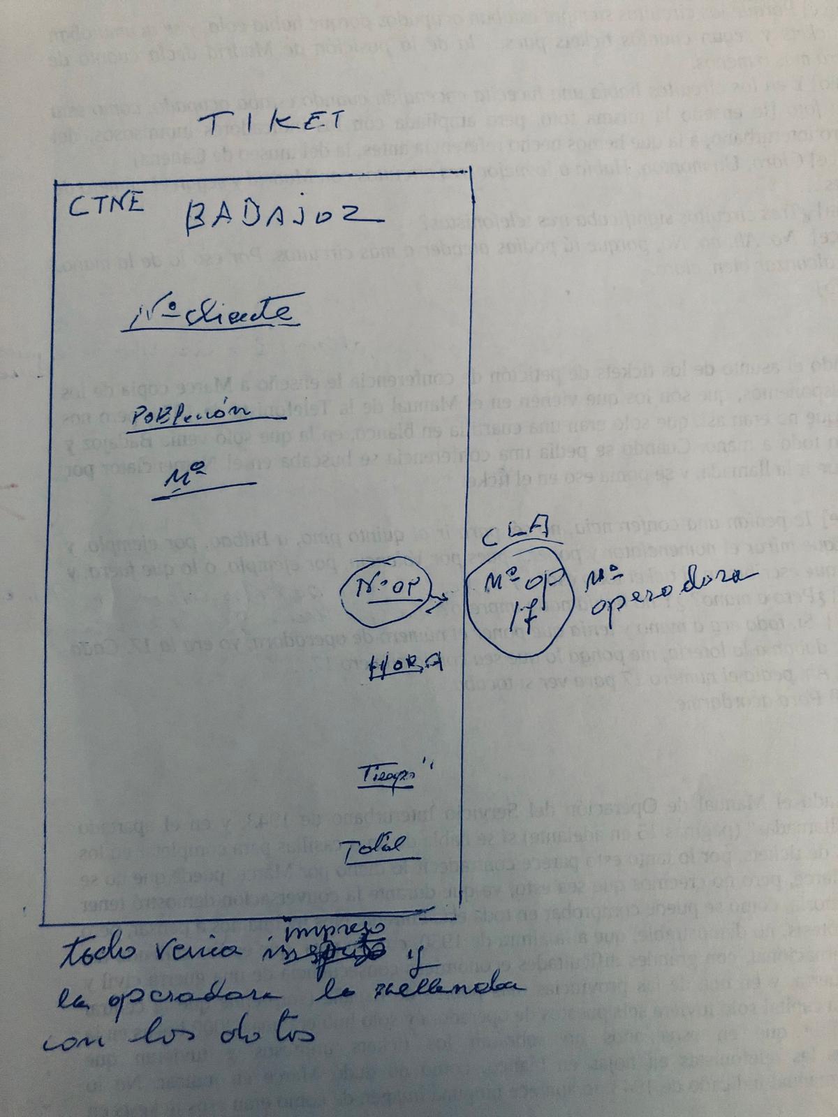 Dado que surgió el asunto de los tickets de petición de conferencia, le enseñamos a Marce copia de los únicos que disponemos, que son los que vienen en el Manual de la Telefonista de 1974, pero nos dijo que no, que no eran así, que solo eran una cuartilla en blanco con algo impreso pero muy poco, en la que solo venía Badajoz y ellas anotaban todo a mano. Cuando se pedía una conferencia se buscaba en el Nomenclátor por dónde tenía que ir la llamada y se ponía eso en el ticket.