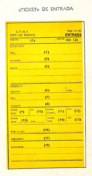Hemos consultado el Manual de Operación del Servicio Interurbano de 1943, y no aparece ninguna imagen de cómo eran esos tickets en esos años. En el apartado “Anotación de llamadas” (páginas 15 en adelante) sí se habla de unas casillas para completar en los diferentes tipos de tickets. [Más adelante, al revisar este texto Marce y su hijo Luis nos aclararon que el ticket era de unos 14cm por 8 cm y nos enviaron un croquis de cómo era].