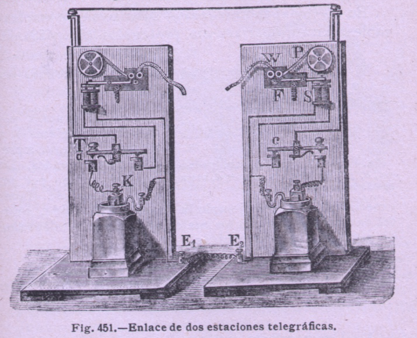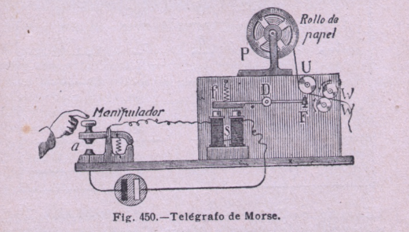 Después se mencionan a los alemanes Sömmering, Gauss y Weber, y Steinhell antes de llegar a Morse, a cuyo telégrafo y a su alfabeto dedica un apartado, para terminar con una corta referencia a las características de las líneas telegráficas de alambre galvanizado con retorno por tierra y diferenciar los «cablegramas», telegramas por cable, por el hecho de cursarse a ultramar por medio de cables submarinos.