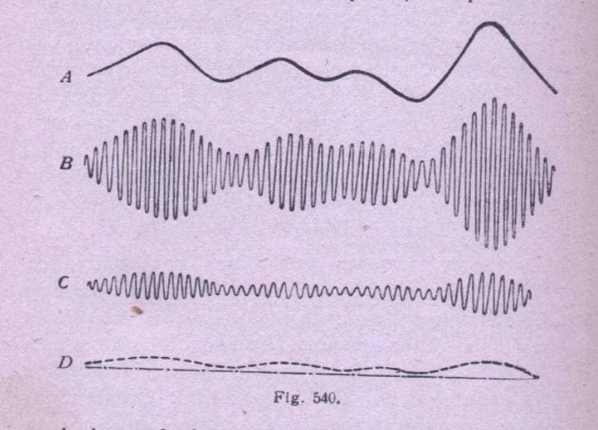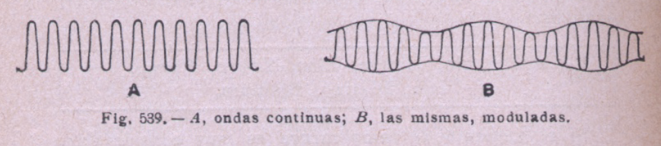 El último apartado del libro se dedica a este tema de la T.S.H. (la «actual» como ya apuntábamos) y comienza ilustrándonos sobre las ondas continuas y las moduladas (con una figura tomada de libro «Compendio de Radiotelefonía» de 1925), mencionando el caso de «la prensa diaria»2.