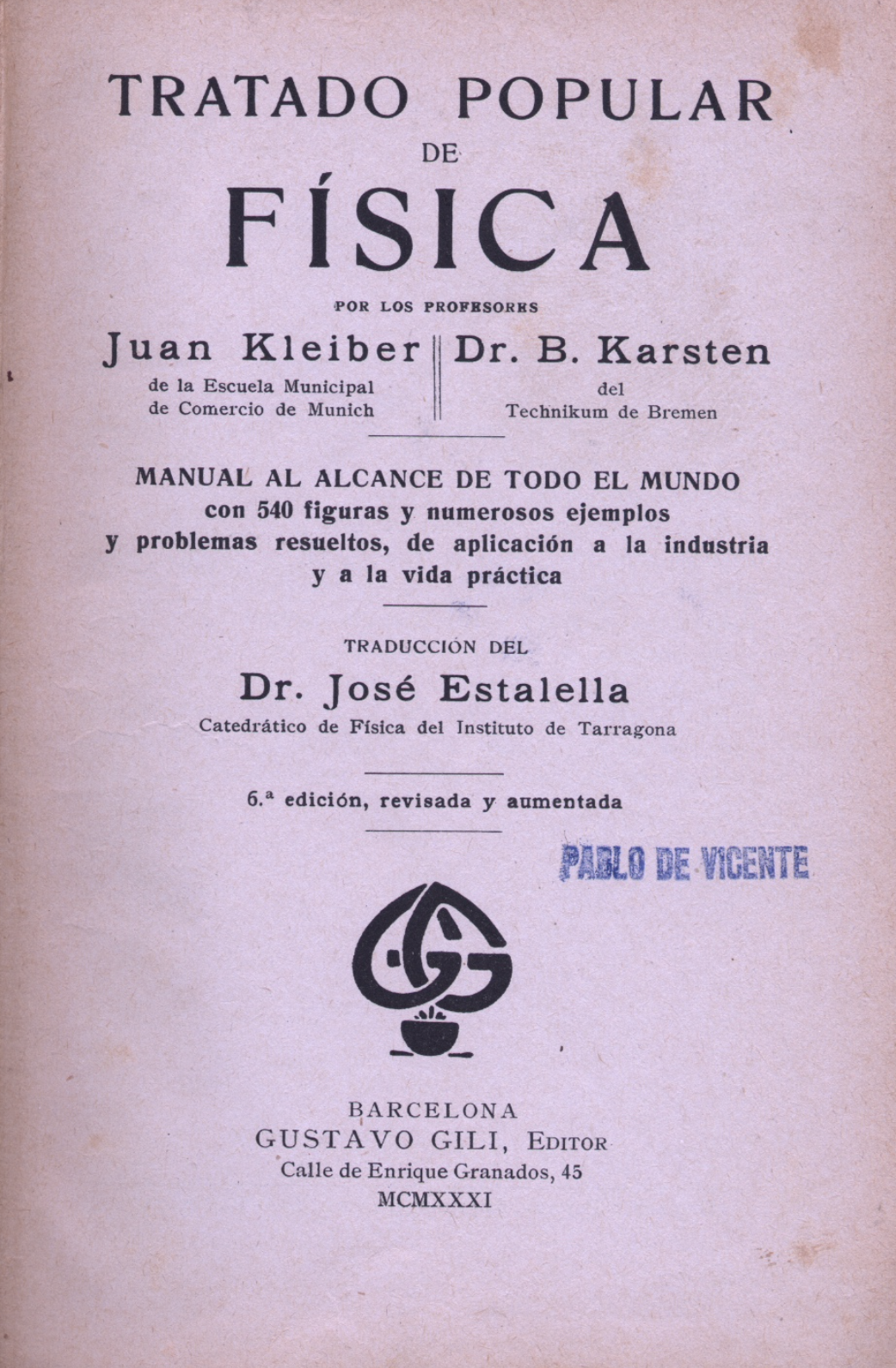 Casi todos los libros de física, tras el prólogo y la relación de las notaciones y abreviaturas que se emplean en el libro (y recordarnos el alfabeto griego), comienzan hablándonos de los componentes básicos de la materia. En este caso los autores, Juan Kleiber, de Munich y el Dr. B.Karseten de Bremen (traducidos por el Dr. José Estalella, del Instituto de Tarragona), y así por ejemplo, nos menciona el «reciente» descubrimiento de el «masurio y el renio» en 19251.