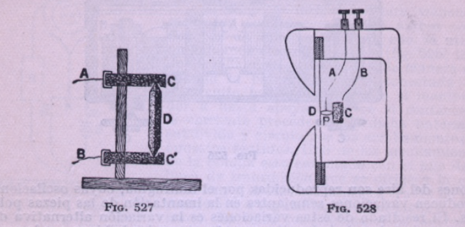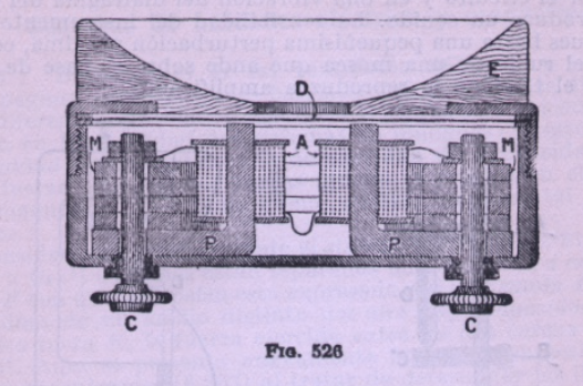 Se detalla a continuación (fig. 526), el funcionamiento del auricular en el apartado que se titula «Teléfono», que atribuye a Bell, y cómo se complementa con el «Micrófono» de Hughes del siguiente apartado (fig. 527), terminando con el «micrófono transmisor» mejorado de Blake (fig. 528).