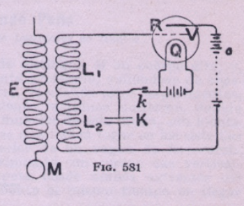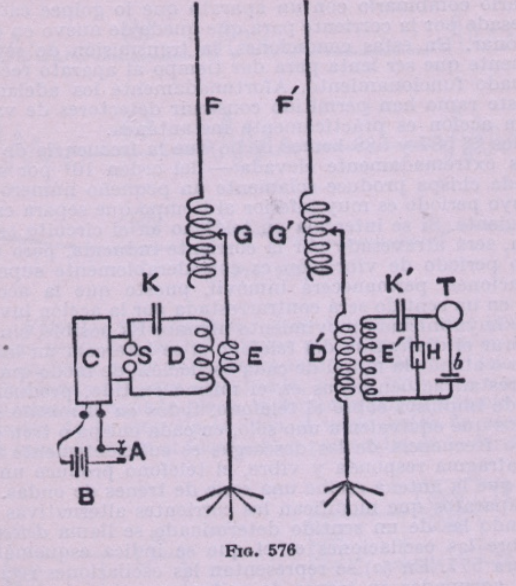 Después se introducen las válvulas termoiónicas como detectores mejorados para concluir con la llamada «telefonía sin hilos» (fig. 581) concebida como medio de comunicación de la voz, sin emplear el término «radio» ni «radioemisión» en ningún momento.