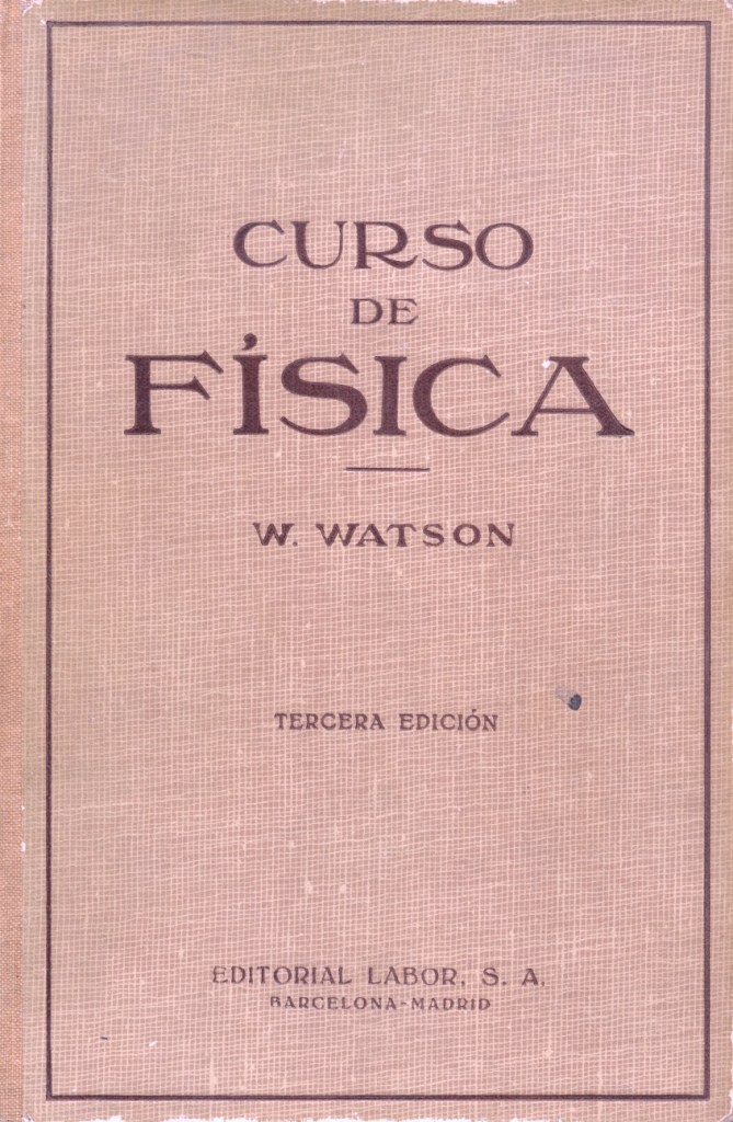 Aunque el ejemplar de que disponemos es de la reimpresión del año 1950, de la tercera edición editada en 1939 por la Editorial Labor SA de Madrid, realmente se trata del «Curso de física: incluyendo un apéndice acerca de la teoría de la relatividad / W. Watson»; traducción de la 8a. ed. inglesa por José Mañas y Bonví del año 1925.