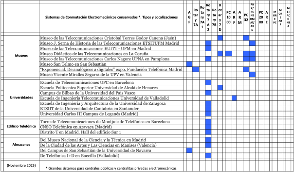 En el cuadro siguiente se puede ver de un vistazo las existencias de las maquetas de equipos de conmutación electromecánica en cada uno de los emplazamientos identificados que se citan.