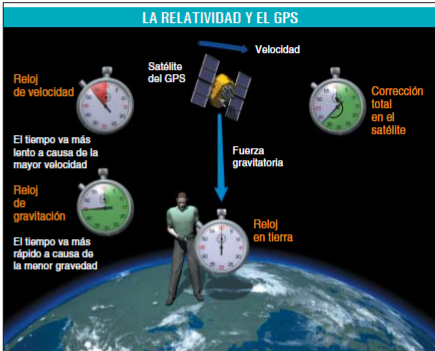 Después de esta breve introducción histórica a los satélites de telecomunicaciones, volvamos al asunto de las necesarias correcciones relativistas del tiempo. Según la relatividad, el tiempo transcurre más despacio en un satélite respecto de la Tierra al estar en movimiento siguiendo su órbita (si solo consideramos el efecto de la velocidad relativa entre los dos sistemas de referencia, el del satélite y el de la Tierra). Pero si además consideramos los efectos gravitatorios, al ser mayor la gravedad en la Tierra que en el satélite, en este último el tiempo corre más deprisa que en la Tierra. Por lo tanto, en los relojes de los satélites hay que compensar este efecto simultáneo de adelanto temporal (por la gravedad) y de retardo (por la velocidad), que no son iguales y por tanto no se anulan mutuamente, para que los relojes de los satélites y de los dispositivos terrestres marquen exactamente la misma hora.