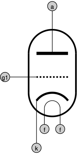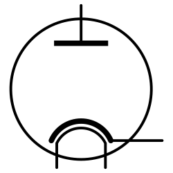 Diodo: Es tubo de vidrio al vacío con dos electrodos (conductores en contacto con el vacío, medio a través del que se cierra un circuito): el cátodo y ánodo. El primero es un filamento que se mantiene incandescente y puede emitir electrones térmicamente. El ánodo se mantiene a temperatura ambiente, con un potencial positivo respecto al cátodo). Los electrodos se conectan a una fuente de diferencia de potencial eléctrico, de forma que los electrones emitidos termoiónicamente por el cátodo se aceleran hacia el ánodo, creando así una corriente electrónica. bajo la acción del campo eléctrico. Su función es la de un semiconductor, al permitir pasar la corriente en un sentido pero no en el contrario.