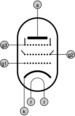 Pentodo. Otro tipo de válvula termoiónica formada por cinco electrodos, con tres rejillas. El sistema de tetrodo creaba también una emisión secundaria en la placa y con el pentodo se mejoraba la amplificación en altas frecuencias. Lo inventaron en 1926 los neerlandeses Gilles Holst y Bernardus Tellegen, que trabajaban para la empresa Philips.