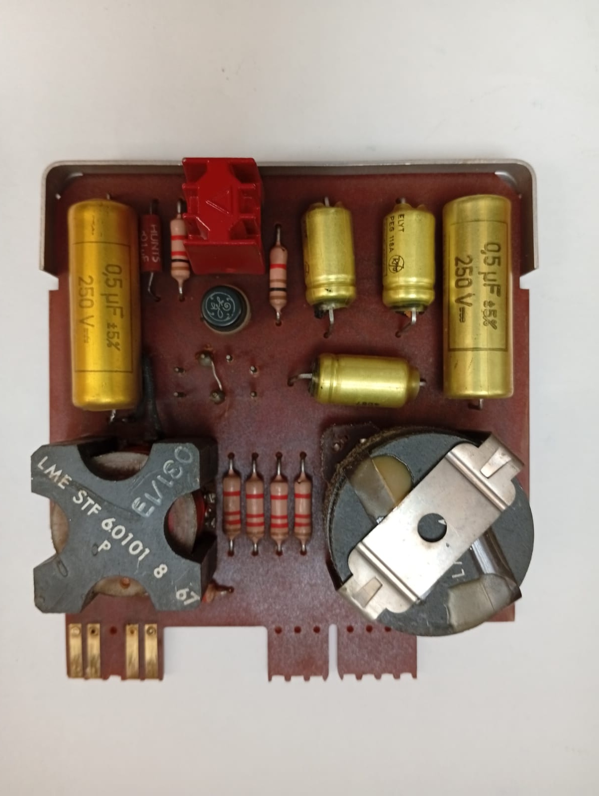 Hubo que reparar la tarjeta del tono de marcar en la centralita cambiando los condensadores electrolíticos. En las imágenes arriba a la derecha tarjeta sin modificar, no funciona, y a la izquierda modificada y funcionando, 400c/s.