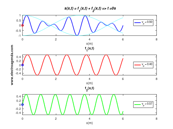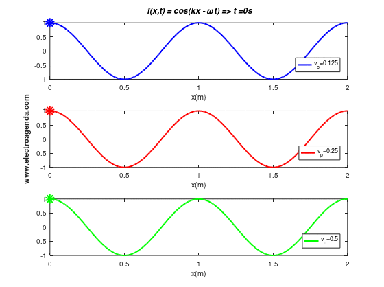 En la imagen anterior las tres ondas están en fase, en cambio en la siguiente imagen las tres están fuera de fase entre todas ellas (Imagen tomada de la web https://electroagenda.com/es/velocidad-de-fase-de-ondas-y-senales/). Nota: os recomendamos visitar esta página web, https://electroagenda.com que es extraordinaria.