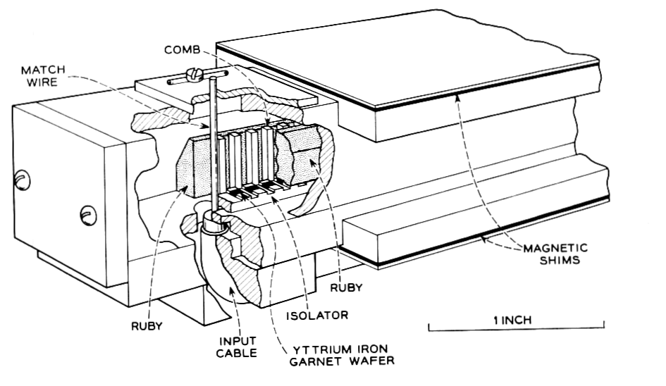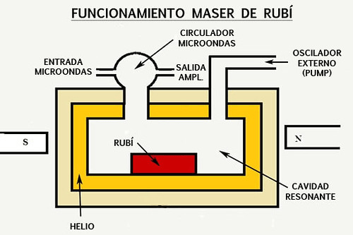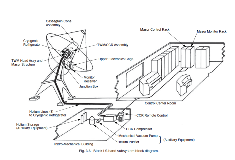 La siguiente imagen representa un esquema general del sistema maser-antena (tomado de la monografía Low-Noise Systems in the Deep Space Network, el capítulo 3 Ruby Masers, urlhttps://descanso.jpl.nasa.gov/monograph/series10/03_Reid_chapt3.pdf.