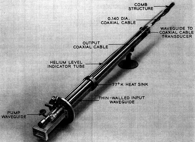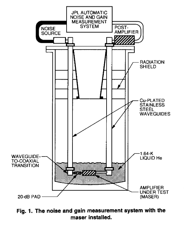 En la siguiente imagen aparece el esquema de un dispositivo ULNA (Ultralow-Noise Amplifier), basado en la tecnología del máser (extraído del artículo de G. W. Glass, G. G. Ortiz y D. L. Johnson “X-Band Ultralow-Noise Maser Amplifier Performance” disponible en la web de la NASA https://ipnpr.jpl.nasa.gov/progress_report/42-116/116t.pdf )
