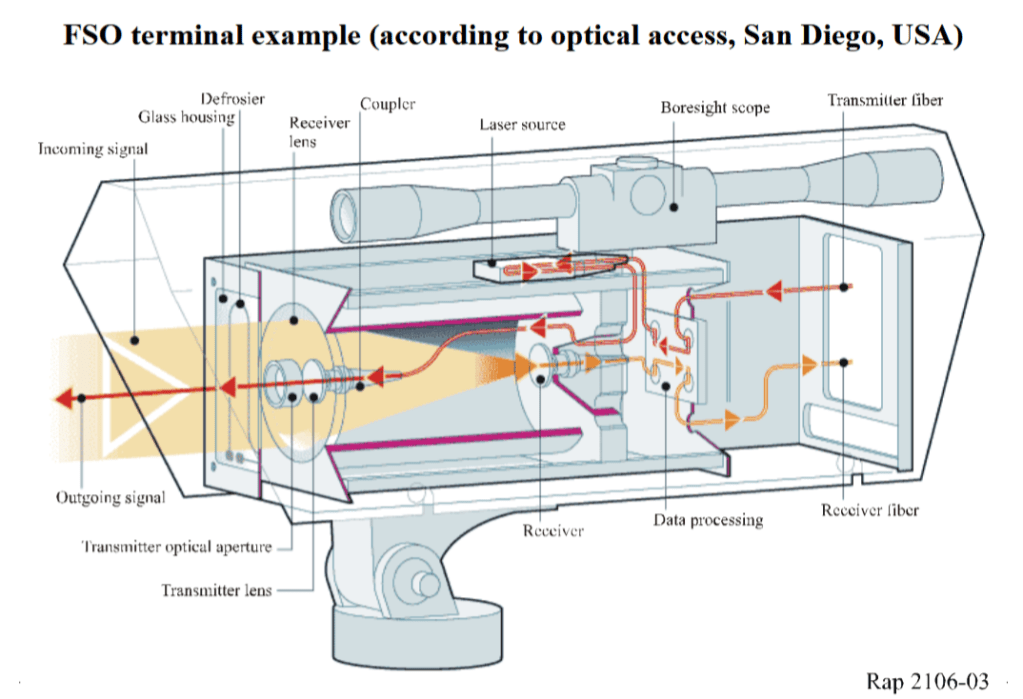 En cuanto a las aplicaciones del láser en telecomunicaciones, la más importante es la de el emisor de luz que se introduce en las fibras ópticas, así como la multiplexación por longitudes de onda (WDM/DWDM para generar muchos canales en la fibra óptica, y, por supuesto, los equipos de medida de las fibras para supervisión y mantenimiento de las misma que usan igualmente tecnología láser. Aparte de las fibras ópticas también se usa el láser en el espacio libre (FSO en sus siglas en inglés) tanto en el aire, por ejemplo comunicaciones entre edificios, como en el espacio para comunicaciones espaciales (disponéis de amplia información en la web de la ITU, en concreto en el informe Fixed service applications using free-space optical links), pero este es otro mundo también extraordinariamente complejo, del que da cuenta, por ejemplo, la siguiente imagen de un terminal FSO.