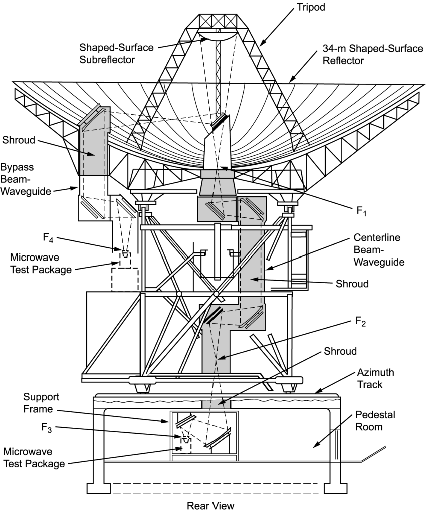 De una de las monografías incluidas en esa web (William A. Imbriale, Large Antennas of the Deep Space Network, podéis acceder al índice de capítulos en el siguiente enlace: https://descanso.jpl.nasa.gov/monograph/series4_chapter.html, y la serie completa de monografías la tenéis en JPL DESCANSO Book Series, Deep Space Communications and Navigation Series ) hemos extraído la siguiente imagen, que ejemplifica muy bien el esquema anteriormente indicado de antena-guía de onda-maser-receptor: