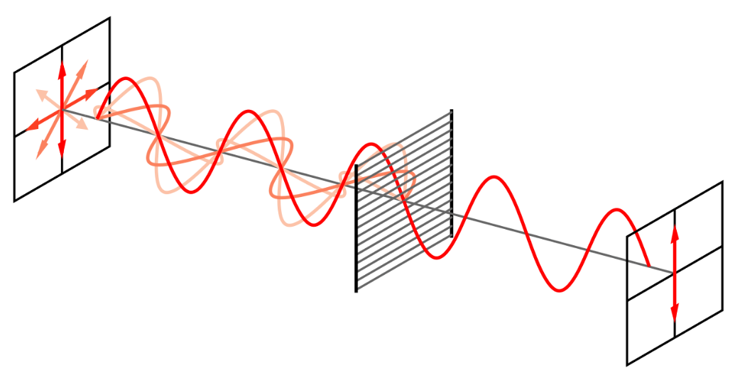Efecto de un polarizador sobre una onda para obtener polarización lineal (Imagen tomada de https://fisicotronica.com/polarizacion-de-ondas-electromagneticas/ )
