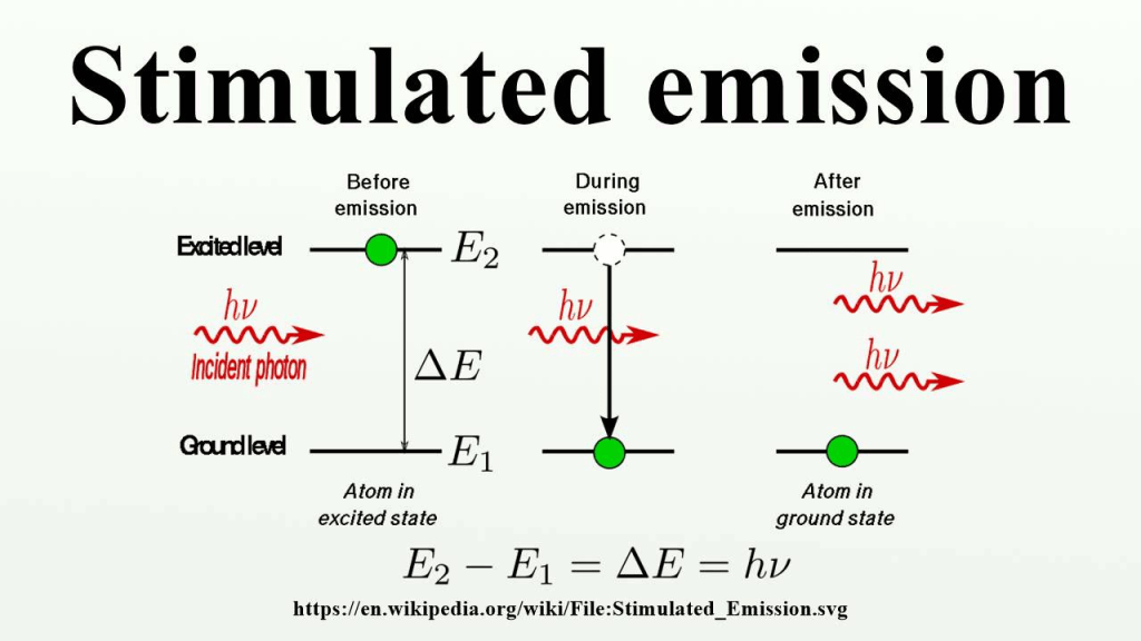 Una vez aclarados los conceptos de fase y polarización, sigamos con los de luz u onda electromagnética estimulada. La idea de luz estimulada se basa en un principio de la física cuántica. Consiste en lo siguiente: los átomos no pueden emitir o absorber energía de forma continua, solo cuantizada, es decir en paquetes o cuantos de energía perfectamente establecidos. Cuando un átomo se encuentra en un estado excitado, por haber absorbido energía de cualquier tipo, es decir con uno o algunos electrones en un nivel de energía más alto del que le corresponde en su nivel fundamental, estos electrones tienden a volver a su nivel de energía estable, en definitiva el átomo tiende a volver a su nivel fundamental, y en ese proceso el átomo libera energía en forma de fotón. En este proceso, si se da en el mismo o en muchos átomos colindantes, los fotones liberados son aleatorios, su dirección, fase y polarización es aleatoria, cada fotón será de la frecuencia de las diferentes transiciones entre estados excitados y fundamentales de los átomos, esto es la luz normal, que no es coherente, que emiten los átomos que conforman moléculas al recibir primero radiación lumínica y segundo radiación que se emite según las frecuencias correspondientes a su estructura atómica; de ahí vemos los diferentes colores característicos de cada material. Es decir, primero se absorbe la energía lumínica, los átomos se excitan y al volver al estado fundamental emiten otra vez esa energía lumínica pero solo la correspondiente a los saltos de energía de los electrones excitados. Todo esto es el proceso normal de la interacción radiación-materia, en el que la emisión de radiación (fotones) se produce de forma espontánea. Ahora bien, cuando un átomo está excitado, podemos incidir sobre él fotones cuya energía coincida con la diferencia de dos niveles permitidos de las capas de ellos electrones. De esta forma, al producirse la transición energética de decaimiento, el fotón liberado tiene la misma energía, dirección, fase y polarización del fotón externo, con lo que se forman fotones coherentes, o lo que se denomina emisión estimulada. El fotón que se emite por la emisión estimulada es idéntico al fotón que desencadenó su emisión, y ambos fotones pueden desencadenar la emisión estimulada en otros átomos, creando una reacción en cadena a nivel molecular de tal forma que tenemos muchos fotones coherentes, lográndose así la amplificación de la luz por emisión estimulada de radiación.