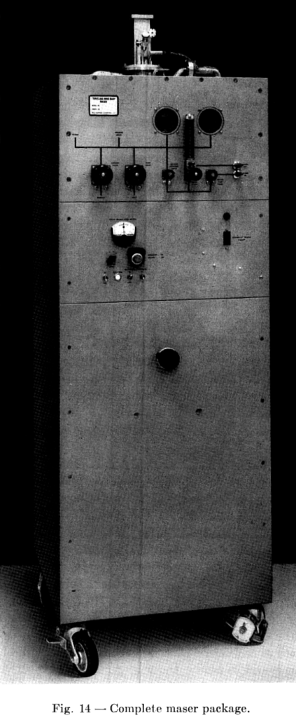 Para el primer caso, el de los satélites TELSTAR, hemos localizado las siguientes imágenes, procedentes del artículo “Masers for the Telstar satellite communications experiment”, Bell System Technical Journal, v. 42-1, july 1963 (https://ia800102.us.archive.org/5/items/bstj42-4-1863/bstj42-4-1863.pdf)