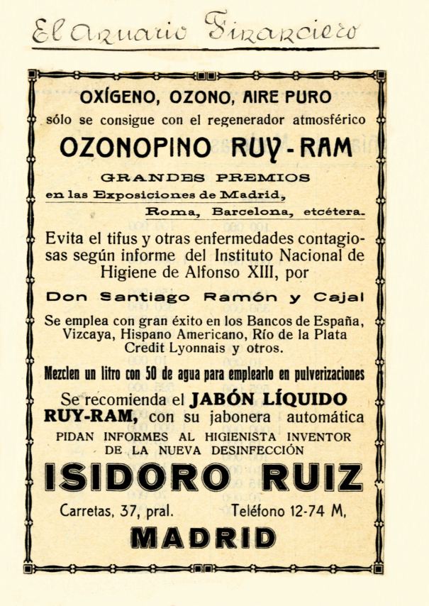 Anuncio Ozonopino Anuario Financiero con indicación del teléfono de la antigua Cia. Madrileña. Archivo Ruiz-Ramos