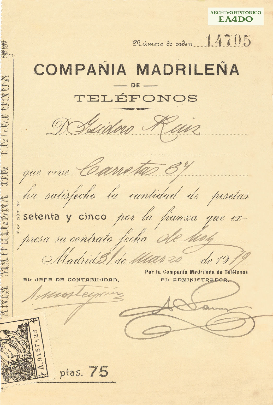 Recibo fianza abono Compañía Madrileña de Teléfonos 1919. Archivo Histórico EA4DO