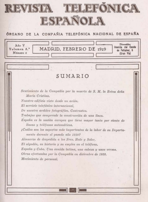Portada y Sumario de Revista Telefónica Española, 1929