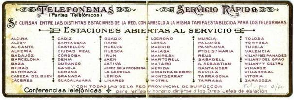 Prontuario Servicio Cía Peninsular Telefonemas. Relación de Estaciones abiertas al servicio. Foto de recuerdoslog.blogspot