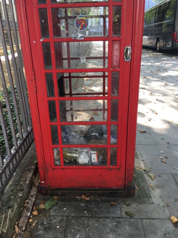 Cabina londinense tristemente empleada como basurero. Foto Javier.