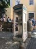 Cabina portuguesa en la entrada del castillo de S. Jorge en Lisboa. Sin puerta y de curioso color. Foto Andrés julio 2018.