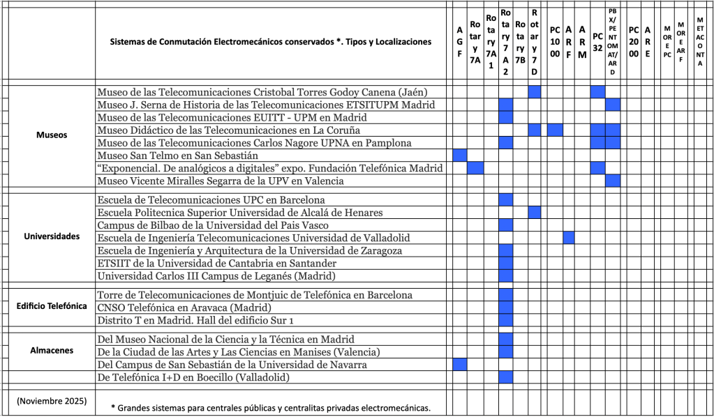 En el cuadro siguiente se puede ver de un vistazo las existencias de las maquetas de equipos de conmutación electromecánica en cada uno de los emplazamientos identificados que se citan.