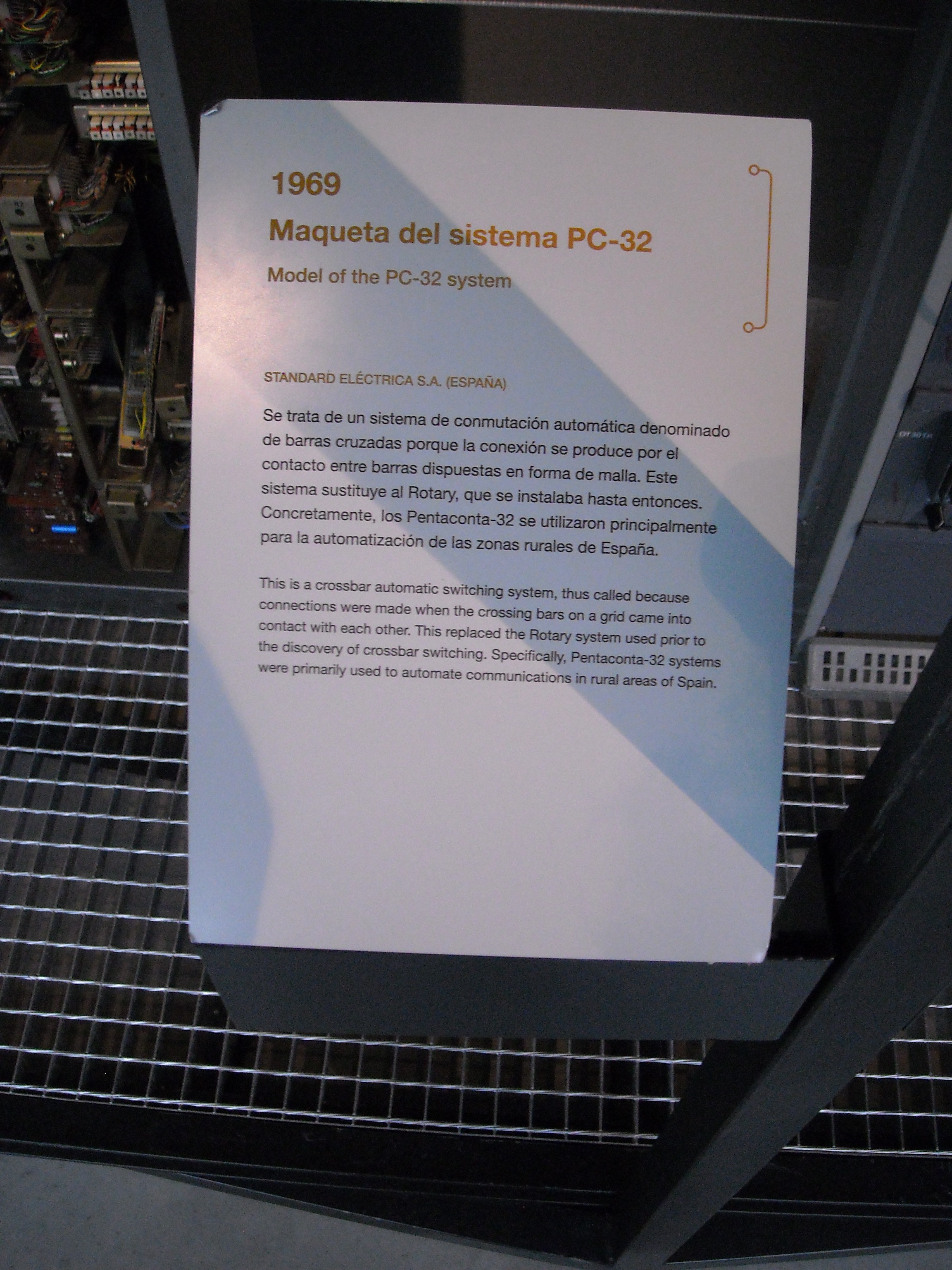 El equipo PC32 es del año 1969 está dispuesto en un sólo bastidor y prestó servicio en la Central Terminal de Unquera (Cantabria), hasta su desmontaje.